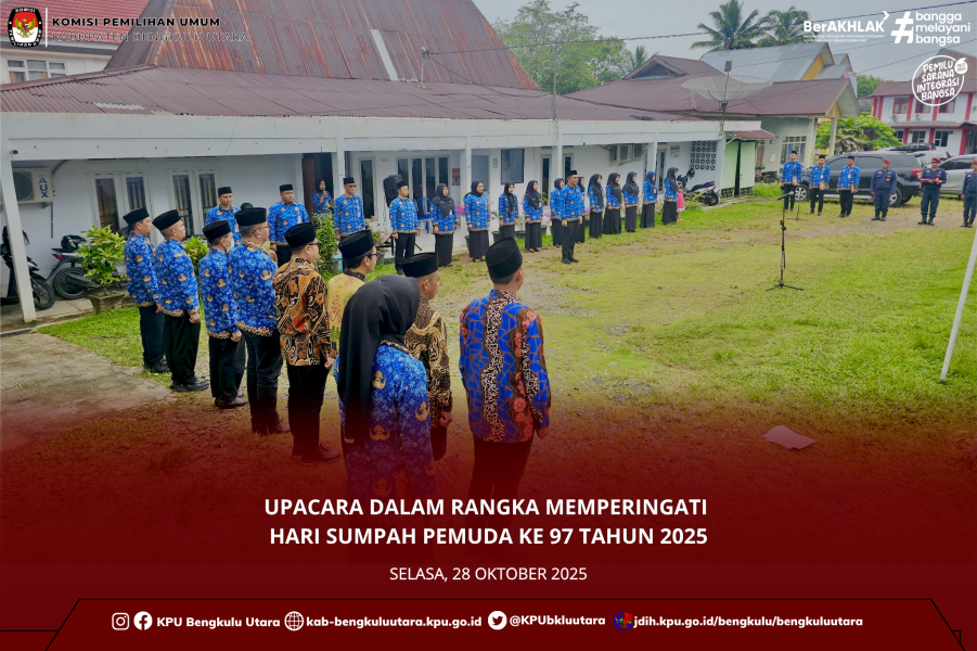 #TemanPemilih, Komisi Pemilihan Umum Kabupaten Bengkulu Utara melaksanakan Upacara Peringatan Hari Sumpah Pemuda ke-97 Tahun 2025, Selasa (28/10/2025) di Halaman Kantor KPU Kabupaten Bengkulu Utara. Bertindak sebagai pembina upacara Anggota KPU Kabupaten Bengkulu Utara Divisi Hukum dan Pengawasan Ervan Gustian. upacara diikuti Anggota KPU Kabupaten Bengkulu Utara, Sekretaris KPU Kabupaten Bengkulu Utara, Staff dan Jaga Saksana KPU Kabupaten Bengkulu Utara. Peringatan ini menjadi momentum untuk meneguhkan semangat persatuan dan komitmen seluruh elemen bangsa, khususnya para pemuda, dalam menjaga keutuhan dan demokrasi Indonesia. #KPUMelayani ....
