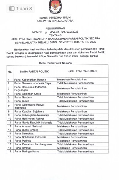 Berdasarkan hasil verifikasi terhadap data dan dokumen pemutakhiran partai politik, dengan ini disampaikan hasil pemutakhiran data dan dokumen Partai Politik secara berkelanjutan melalui Sipol Semester dua tahun 2025, silahkan klik pada link berikut ini untuk melihat data : Pengumuman Hasil Pemutakhiran Data dan Dokumen Partai Politik ....