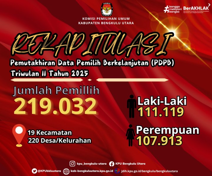 Berdasarkan keputusan KPU Kabupaten Bengkulu Utara Nomor 16 Tahun 2025 menetapkan bahwa rekapitulasi pemutakhiran data pemilih berkelanjutan Triwulan II tahun 2025 yakni pemilih Laki-laki berjumlah 111.119, Perempuan 107.913 segingga total pemilih 219.032.