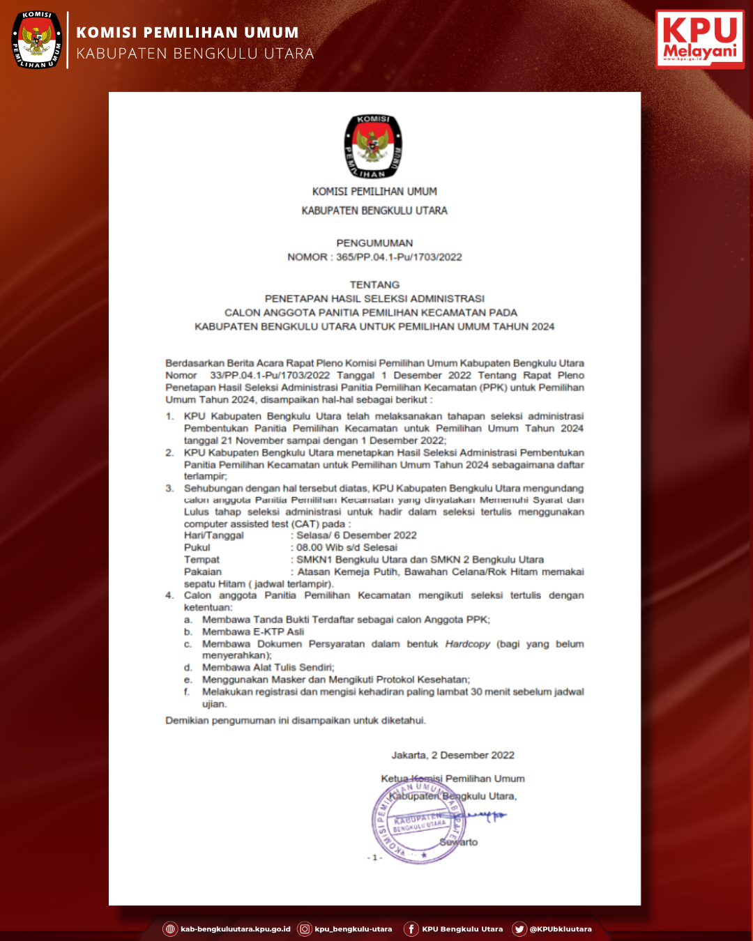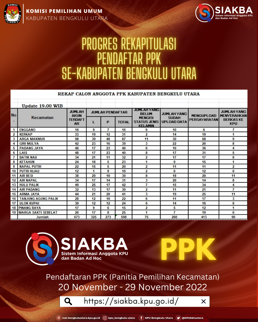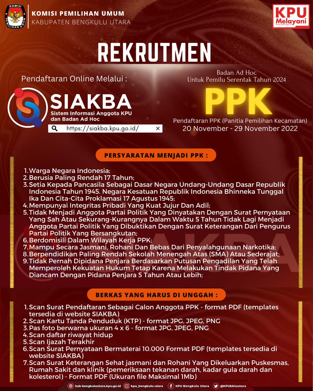 Pantau terus sosial media dari kita ya, atau kamu bisa dateng langsung ke Helpdesk SIAKBA KPU Kabupaten Bengkulu Utara di Jl. Moh. Yamin, Kali, Kec. Arga Makmur, Kabupaten Bengkulu Utara.