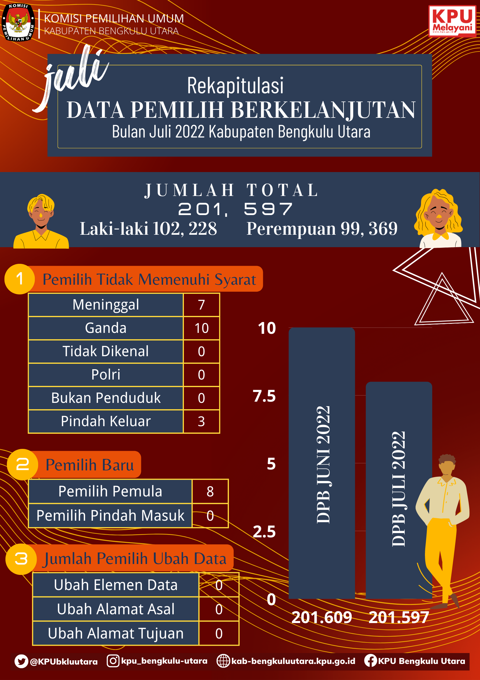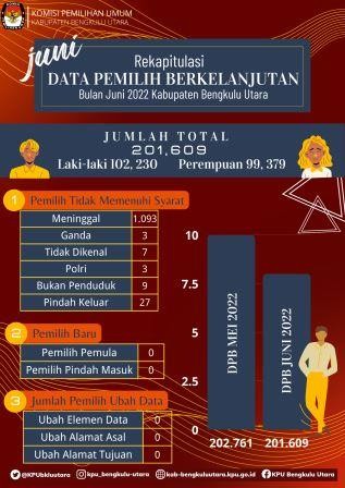 Hasil rekapitulasi daftar pemilih berkelanjutan pada Bulan Maret Tahun 2022 sebagai berikut 6 TMS, 7 Pemilih Baru, dan 29 ubah data serta total 202.737 pemilih dengan rincian 102.900 laki-laki dan 99.837 perempuan.